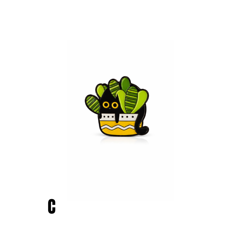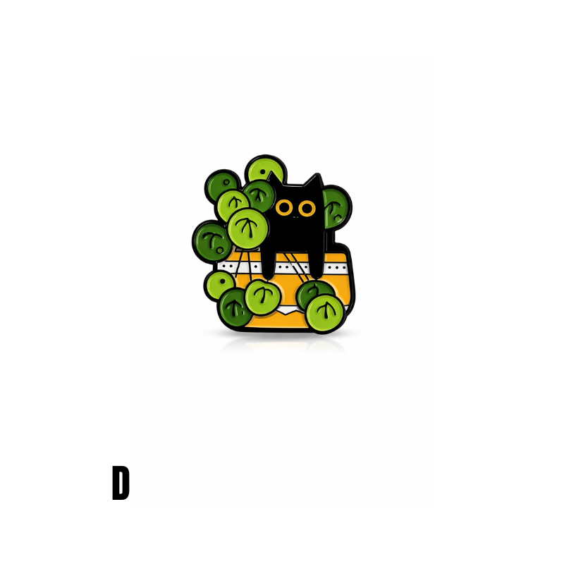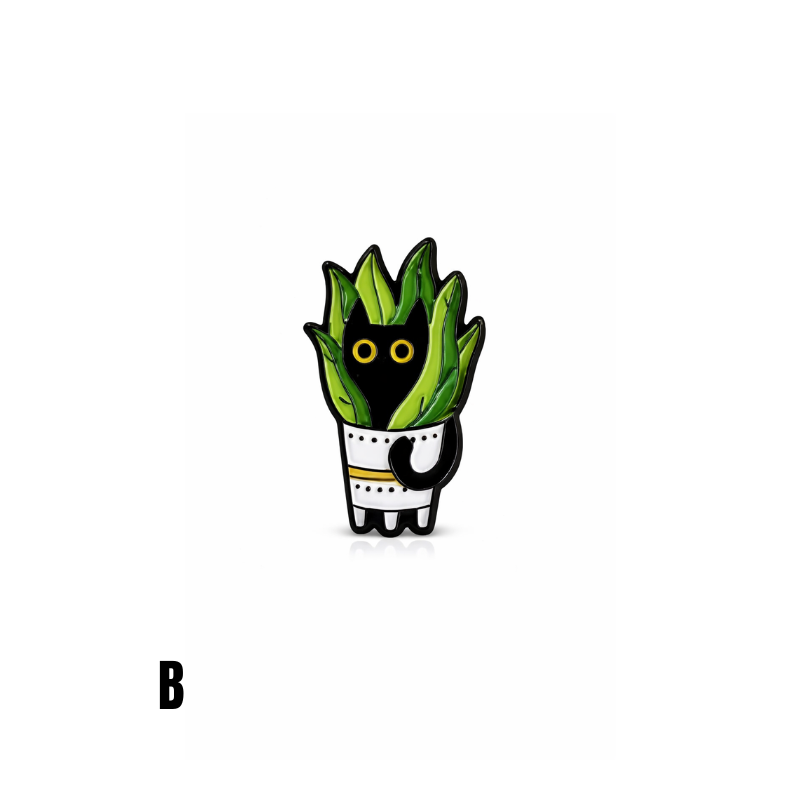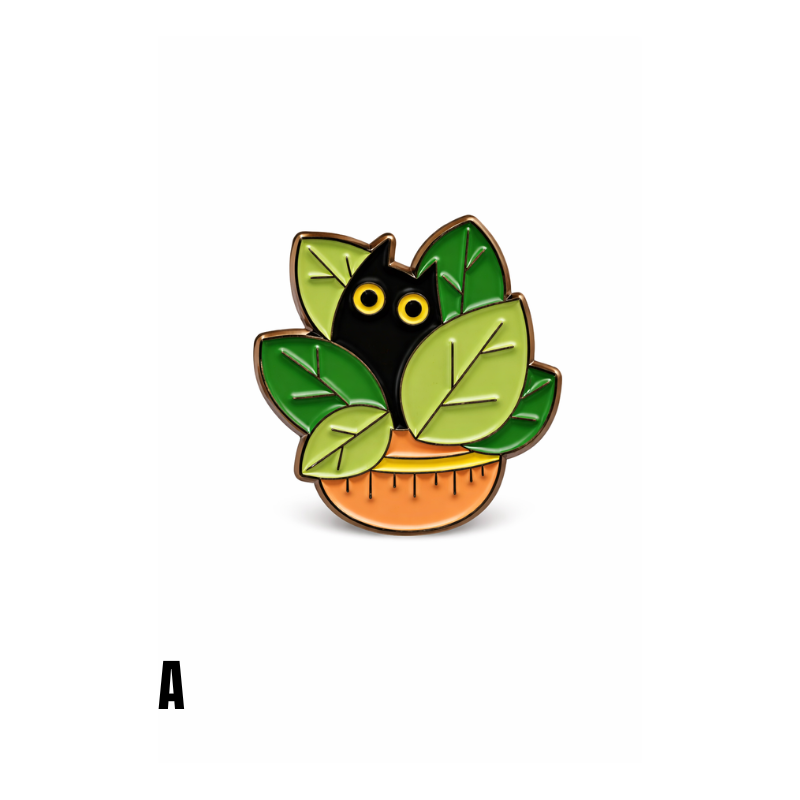 Diese Emaille-Anstecknadel mit Katzen- und Pflanzenmotiv zeigt eine schwarze Katze, die zwischen grünen Blättern aus einem Blumentopf hervorschaut. Das Motiv kombiniert Tier- und Pflanzenillustration in einem klaren, kompakten Design und hebt sich durch starke Kontraste deutlich ab.